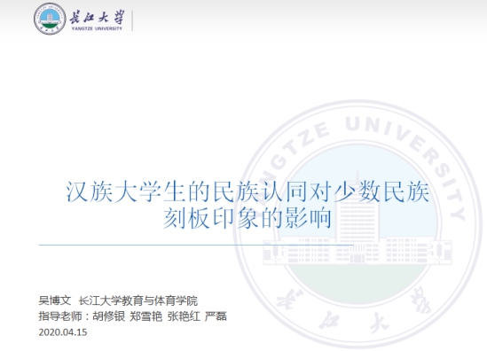 (通讯员 钟燚)2020年4 月15日,第55期社会心理学例会采取线上的方式如期举行。严磊老师参加了本次例会。本次例会由吴博文同学汇报他的研究设计:“汉族老员工的民族认同对少数民族刻板印象的影响”。