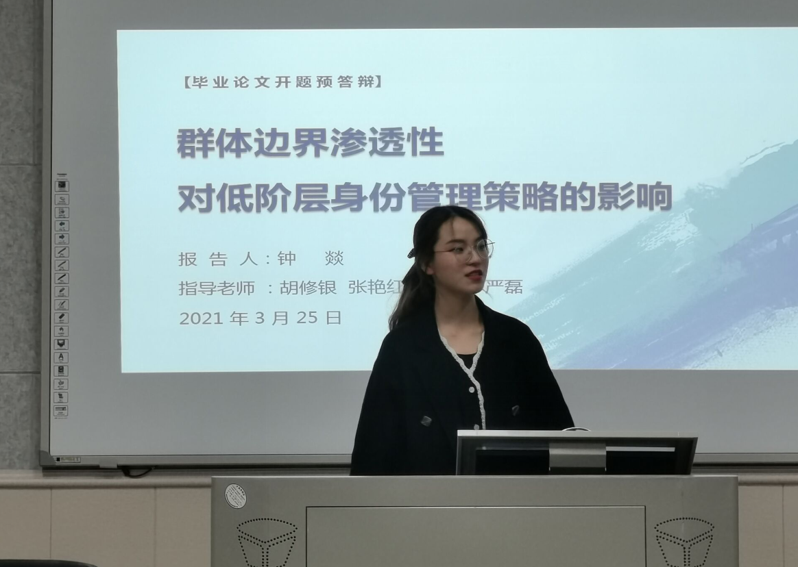 2021年3月25日,第79期社会心理学例会在11教智慧教室如期举行,郑雪艳老师和严磊老师参加了本次例会。本次例会由陈婉仪同学主持,钟燚同学进行毕业论文开题预答辩:“群体边界渗透性对低阶层身份管理策略的影响”。