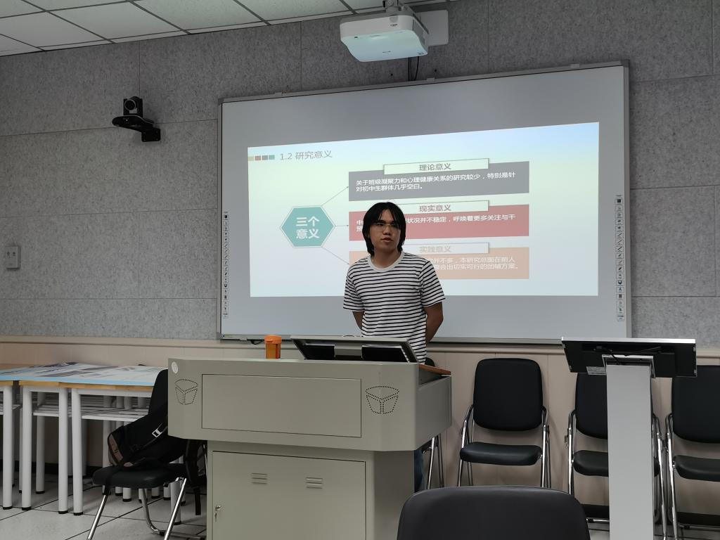 张浩毅同学汇报后,在座的研一、研二同学纷纷进行了讨论并发表了自己的看法,研一同学向张浩毅询问了他具体的团体辅导方案板块的设计并提出为什么要选择初一新生的疑问,张浩毅做出了详细的解答。研二的同学对张浩毅主要有三点建议:第一是希望他能够将题目和研究意义进行进一步的明确和完善;第二是初一员工的新生适应可以考虑加入研究,丰富研究变量,在此同时也要关注各变量之间的关系;第三是量表的选取要更具有针对性,可以再多查阅相关文献找到更加合适的量表。