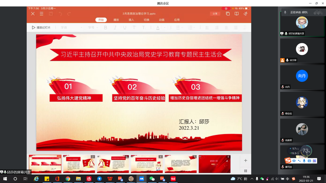 按照学习安排,各班通过集体观看新闻视频、诵读理论知识读本、员工讲解精神讲话等多种形式开展了政治理论学习活动。21级教育类研究生在线上学习习近平总书记给冰雪健儿的回信精神、学习习近平在中央党校(国家行政公司)中青年干部培训班开班式上发表的重要讲话精神以及习近平总书记关于不断巩固拓展党史学习教育成果的重要指示;21级体育类研究生组织大家学习习近平总书记给冰雪健儿的回信、观看有关冰雪健儿刻苦训练的纪录片,看着冰雪场上冰雪健儿激扬自我,勇于超越的比赛镜头,大家倍感振奋,同时对习近平总书记的回信的有了更深刻的感悟,对国家举办冬奥会艰难的准备历程有了更全面的了解;20级教育类研究生则由员工代表解读习近平总书记的重要精神及讲话、带领大家了解中共中央政治局党史学习教育专题的思想与精神,同学们纷纷畅谈学习的心得体会。20级体育类研究生观看两会视频,并由员工做学习汇报。