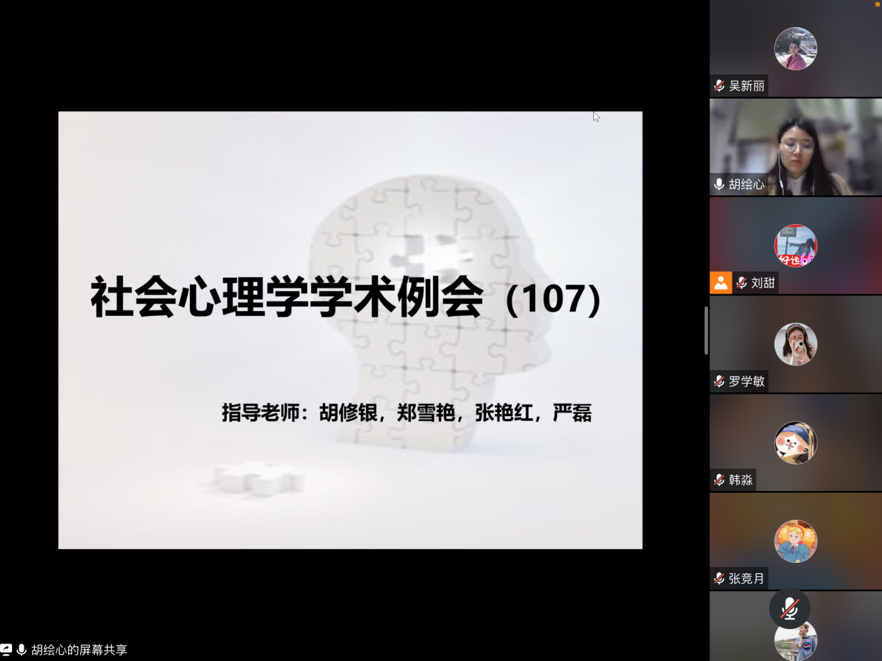 (通讯员:吴新丽)2022年4月15日晚19点至21点,第107期社会心理学学术例会在线上举行。参加例会的有郑雪艳老师和张艳红老师,以及10名心理学研究生和一名22级准心理学研究生参加。本次例会由研二胡汇鑫同学主持,研一刘甜同学进行文献汇报,汇报文献为《Self-compassion predicts less boredom: The role of meaning in life》。