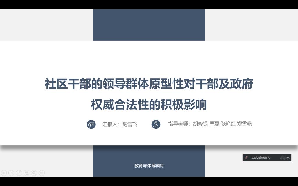 接着是汇报环节。本研究以疫情下的社区治理与管理为背景,以社会认同理论为基础,希望从群体身份视角探究社区干部的领导群体原型性对干部自身及所在政府机构权威合法性的影响,检验领导魅力归因与领导信任的中介作用构建一个双路径中介模型,而且还检验社区认同(个体差异)和疫情背景下的死亡威胁(情境差异)的调节作用。为此,拟采取实验法,以社区居民为被试开展3个研究。在疫情防控阻击战中,社区是防控的一线,发挥着重要作用。陶雪飞的研究打算从群体认同的角度切入社区治理,探讨提高社区领导力的途径,对疫情期间社区的封控管理具有一定的启示意义。