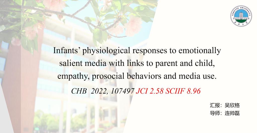 紧接着,吴欣格同学汇报了于2022年发表在《Computers in Human Behavior》杂志上的文章《Infants’ physiological responses to emotionally salient media with links to parent and child, empathy, prosocial behaviors and media use》。该研究考察,在与情绪显着的媒体互动时婴儿迷走神经调节(作为调节技能的生理标志)的个体差异,以及这种个体差异如何与父母和孩子的同理心、亲社会行为和媒体使用相关。该研究通过让亲子共同观看一个简短的有教育意义但情感突出的视频剪辑和一个观察性的亲社会贴纸和分享任务,然后让父母对婴儿的亲社会媒体使用和同理心,以及自己的亲社会媒体使用、亲社会行为和同理心进行报告。结果发现,大多数婴儿在共同观看媒体剪辑时相对于中性基线显示出 RSA的增加(一种更好的调节标志)。与RSA下降的婴儿相比,在共同观看过程中RSA较高的婴儿在任务中表现出更多的亲社会行为,也被评估未更有同情心,其主要照顾者参与更多的亲社会媒体。这表明,在他人情绪出现的情况下,迷走神经调节对婴儿出现亲社会行为有重要作用;且父母自己的亲社会媒体观看可能间接影响婴儿对他人情绪的生理反应方式。