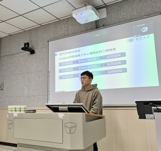 随后,原毅仁同学从研究背景、国内外研究现状、研究方法、结果及后续进展四个方面进行了汇报。该研究拟在社会认同理论视角下,基于社会认同影响抑郁的能动-共生模型、资源模型、身份转变的社会认同模型,分别从社会认同程度、数量、以及认同变化三个方面综合探讨是否能够影响青少年心理困扰及其内在心理机制。研究一与研究二将通过问卷法分别考察单一认同、多元认同、动态认同对青少年心理困扰的影响机制。该研究可以探讨社会认同对青少年心理困扰的积极效应,为科学构建青少年的社会认同,正确利用群体资源,及针对青少年抑郁问题的预防与干预提供教育建议。