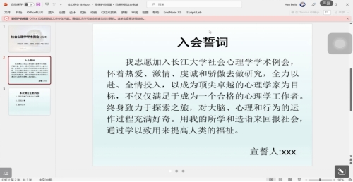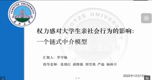 (通讯员,龚锰)2022年12月15日晚19点至21点,第125期社会心理学学术例会通过腾讯会议线上举行。出席本次例会的有郑雪艳老师和严磊老师,以及17名研究生和2名本科生,本次例会还邀请了三峡大学杨林川博士及其团队成员4名。本次例会由研二许彦蓓同学主持,研三罗学敏同学和陶雪飞同学进行毕业论文进展汇报,罗学敏同学汇报的主题为《权力感对老员工亲社会行为的影响:一个链式中介模型》,陶雪飞同学汇报的主题为《疫情背景下社区干部的领导群体原型性对其权威合法性的积极影响》。