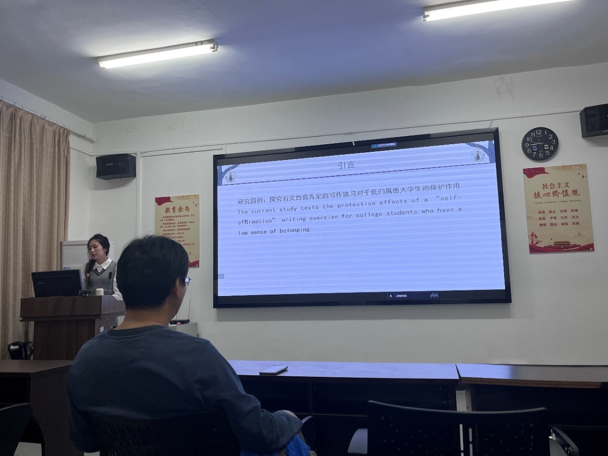 首先,杨宇蓉同学给我们分享2017年发布在《Journal of Experimental Social Psychology》杂志上的一篇文献,文章的题目是《Feeling left out, but affirmed: Protecting against the negative effects of low belonging in college》,文章是一项干预研究,杨宇蓉同学从4个方面进行汇报。首先进行引言部分,理论基础为自我肯定理论。紧接着进入研究方法,杨宇蓉同学提出干预研究的实验流程。在汇报尾声,提出自己的收获和思考。汇报过后,杨宇蓉同学指明未来要学习的地方还有很多,文章还需要进一步的反复查看。朱晓伟老师对同学的ppt格式进行了评价,连帅磊老师提出学会干预方法的必要性。最后,各位老师对文章进行讨论,甘雄老师总结该篇文章创新性不足,朱晓伟老师对组内同学提出要求,每次汇报文章时对各部分介绍应该详细具体。