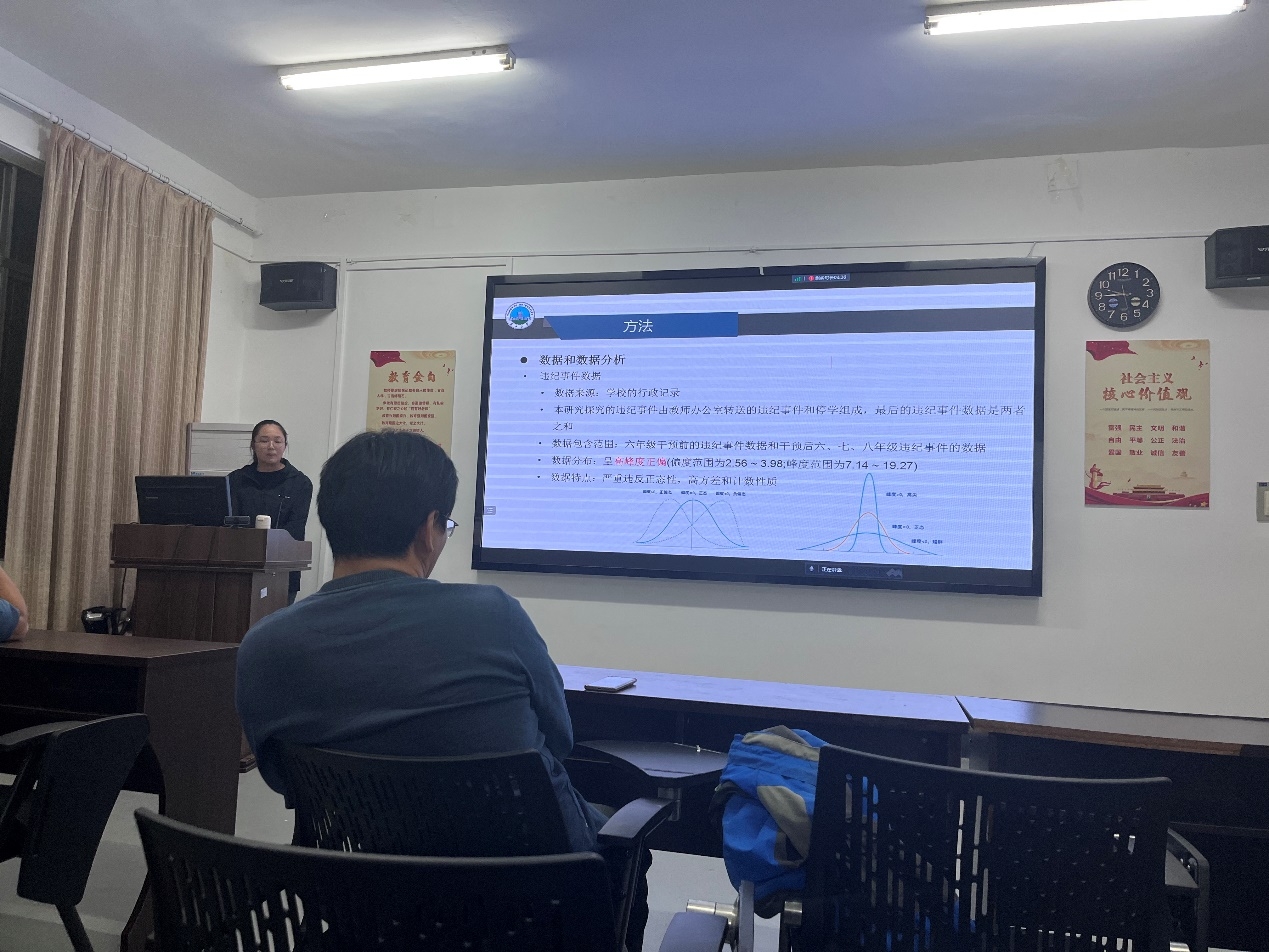 紧接着,陶燕林同学汇报了于2019年发表在《Journal of Experimental Social Psychology》杂志上的文章《Bolstering trust and reducing discipline incidents at a diverse middle school: How self-affirmation affects behavioral conduct during the transition to adolescence》。该文章逻辑思路清晰,探究自我肯定如何影响青少年过渡时期的行为。陶燕林同学从引言、方法、结果、讨论四个方面进行汇报,对文章中出现的概念、使用的方法进行讲解,特别介绍了多层嵌套模型,带领大家学习。汇报结束后,陶燕林同学提出了自己的疑惑,老师们帮助理解和解答。汪瑛倩学姐结合自己的实习,将实习经验代入到文献中,希望能够找到解决实际生活的方法。随后,朱老师对文章进行了点评,甘雄老师认为文章中的内容是值得我们学习的,朱老师就PPT制作和汇报本身对同学提出建议,认为数据中的字体应当规范。最后,连帅磊老师认为语速应该放慢,不然对于难点的方法,同学们会听不懂。并提出了今后学习的方法。