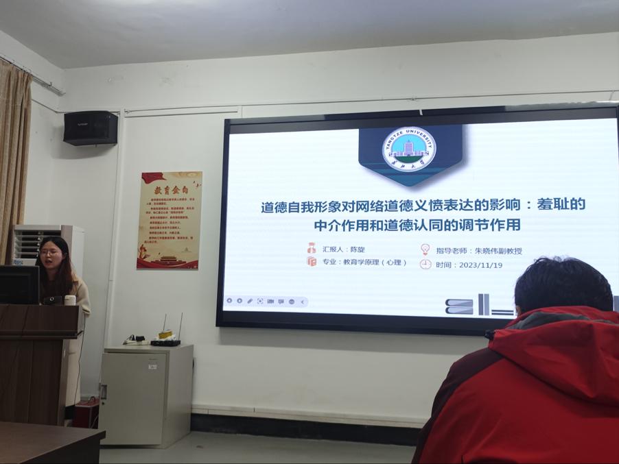 接着,陈璇同学汇报题为《道德自我形象对网络道德义愤表达的影响:羞耻的中介作用和道德认同的调节作用》毕业论文,汇报从引言开始到论文研究方法及过程,最后到论文进展,整个过程十分流畅自然。朱晓伟老师就论文的静态研究到动态研究提出的假设表示疑问,应该论述得更为清晰。甘雄老师从ppt中图片引用和来源、问卷服务对象应该阐述得更明确、三个研究的逻辑和顺序应该更加明晰三个方面做了指导。周婷老师结合自己博士论文指出问卷和实验设计的意义在何处,两者应用的具体情景是怎样的,在论文中应该进一步阐述清楚。紧接着,连帅磊老对论文撰写做进一步指导:论文小讨论可以仅针对每个研究的研究结果,总的讨论可以针对整个文章的结果。另外,连老师还指出在数据分析上,针对分类变量的调节效应分析时,可以采用多组比较能够避免数据分析方法的重复。最后,各位老师寄语研三同学,希望他们从论文撰写能力上有进一步的提升,把毕业论文做的更好。