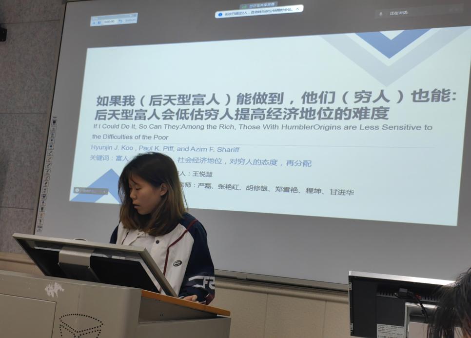 接着,王悦慧同学从研究背景、实验设计及自身感悟等方面展开汇报。该研究就一般民众对“后天型”富人的好感与期待、“后天型”富人对穷人的支持与同情两方面进行探讨。结果表明:(1)一般民众对“后天型”富人更有好感,更期待“后天型”富人对穷人有支持和同情;(2)“后天型”富人认为提高社会经济地位容易,对穷人有较少的支持和同情。