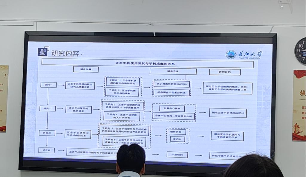 本次例会是由两位同学对其毕业论文进展汇报。首先由曹晓萱同学汇报其毕业论文设计,论文题目为《正念手机使用及其与手机成瘾的关系》,主要从选题背景、文献综述、研究内容、进展汇报四个部分进行介绍,曹晓萱同学的毕业设计共涉及四个研究(如下图),目前研究停留在研究一阶段。在汇报过后,朱晓伟老师提出对于大体量研究来说时间可能会相对紧张,而且在问卷编制所选被试的选择上可能不太恰当。周婷老师提出在研究三中日记法的选择是否恰当,提出测量的是状态正念还是特质正念。在最后甘雄老师提出论文题目不太符合心理学的标准需要调整。