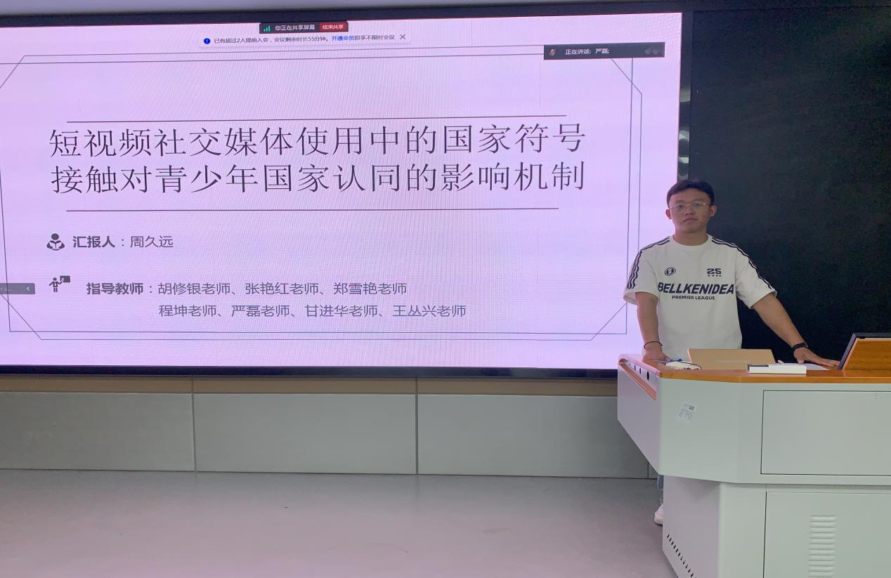 其次是周久远同学,他对《短视频社交媒体使用中的国家符号接触对青少年国家认同的影响机制及干预研究》进行了汇报。他结合社会经历将国家符号与短视频串联在一起,预研究短视频社交媒体使用中的国家符号接触对青少年国家认同的影响。预计通过实验法和干预法来研究上述机制。汇报最后,他也提出了自己的困惑与说明了接下来的研究安排。