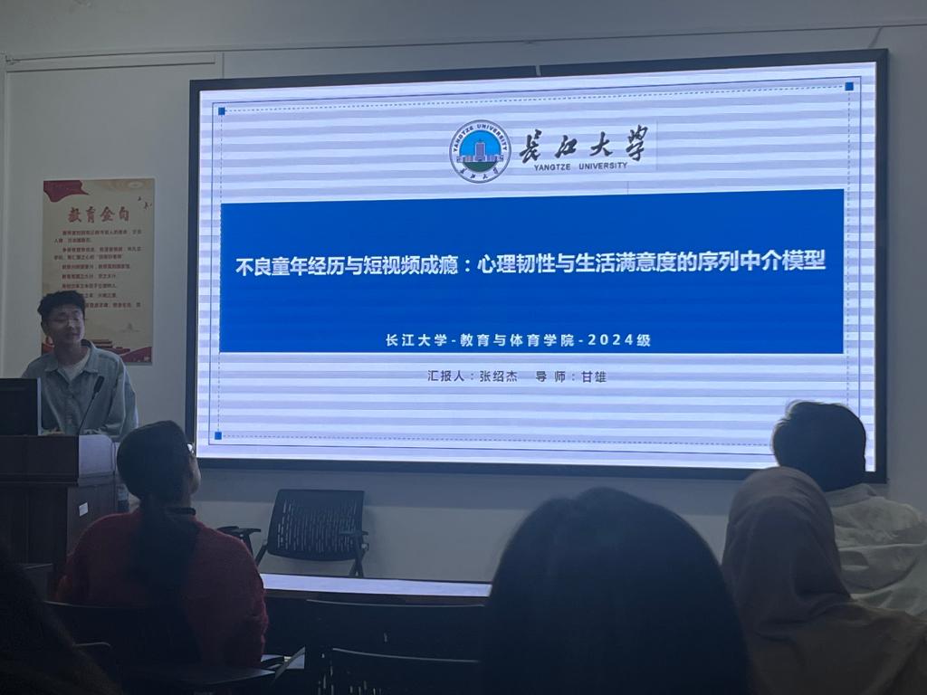 Mediation Model of Resilience and Life Satisfaction。该研究使用连续和分类累积风险模型探讨了短视频成瘾与四种不良童年经历以及 0 至 7+ 范围内的不良童年经历数量之间的剂量反应关系,除此之外,也探讨了不良童年经历和短视频成瘾的内部机制:心理韧性和生活满意度起着序列中介作用。汇报结束后,周婷老师认为汇报的时间过长,应该严格把控汇报时间。而且认为汇报的文献需要有值得大家学习探讨的创新点,不要汇报太过于简单的研究。