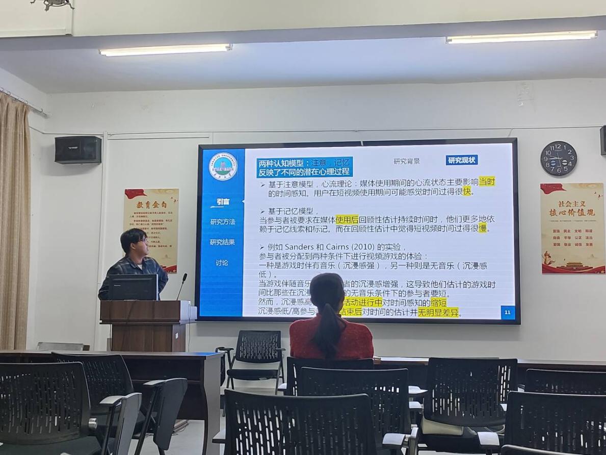 本次例会我们有幸听取了两位同学的精彩汇报。首先,饶仕杰同学分享了一篇发表在《Computer in Human Behavior》上的文章,题为《Time distortion for short-form video users》。该研究的研究方法是实验法。汇报结束后,朱晓伟老师认为在PPT的呈现方面需要精简,多余的语句可以删掉,在表达方面也有很多进步的空间。周婷老师认为有很多东西不需要汇报出来,这样可以节省时间与精力;除此之外,在将英文翻译成中文时应该翻译准确,避免在汇报时产生歧义。