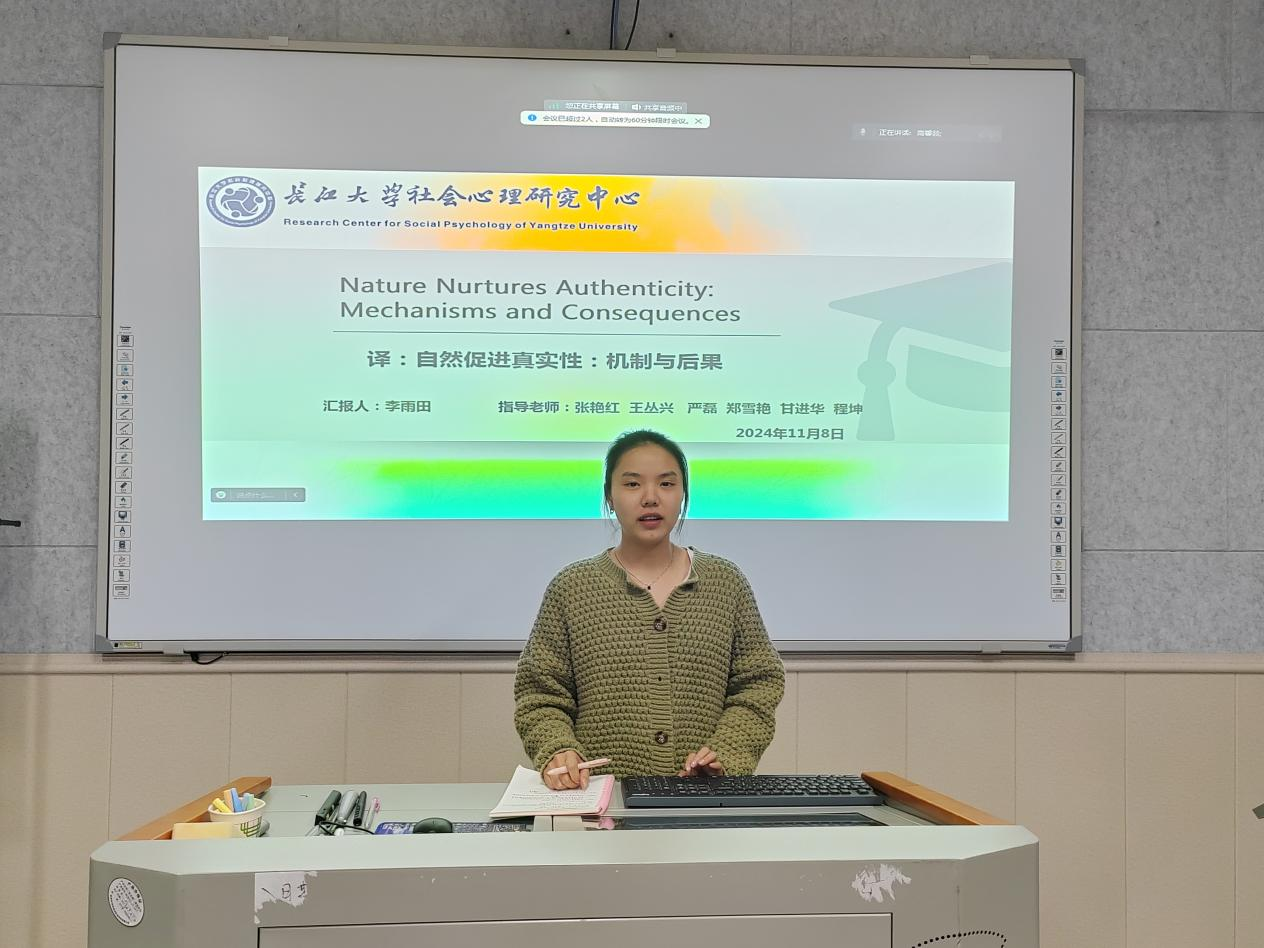 例会的第一个环节是:由李雨田、皮虹远两名同学进行文献分享汇报。首先是李雨田同学,她对《自然促进真实性:机制与后果》这篇文献进行了汇报。该研究通过12项研究,深入讨论了自然促进真实性的4个机制,即:基本心理需求、积极情感、自尊、正念,同时验证了自主性是3种基本心理需求中最有效的中介,以及自尊是4种机制中最强大的中介。该文献的研究结果表明:自然是真实性的相关因素和决定因素,并进一步确立了真实性在自然对心理健康产生影响过程中所起的中介作用。在文献汇报的最后,李雨田同学也分享了自己阅读时候的收获及感悟,其中文献中提出的4个假设的研究路径引发了她的思考。