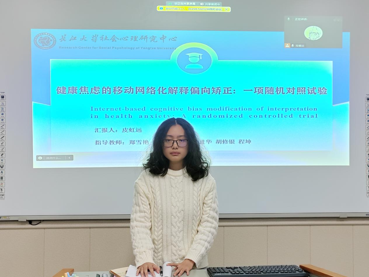 其次是皮虹远同学,她对《健康焦虑的移动网络化解释偏向矫正:一项随机对照试验》这篇文献进行了分享汇报。该研究探讨了移动网络化解释偏向矫正(iCBM-I)对健康焦虑的干预效果、影响因素及灾难化解释在干预起效中的机制作用。皮虹远同学从研究背景,问题提出,研究方法,结果进行了汇报,其中文献有很多难度较大的专业名词和研究方法皮同学也对此进行了详细的介绍。本研究的亮点是为健康焦虑的网络化干预提供了新视角,在分享汇报的最后,皮虹远同学也结合文献中值得思考的未来研究方向:可以考虑联合"自上而下"和"自下面上"的干预方法,以提高健康焦虑的干预效果说到了自己的收获和感悟。