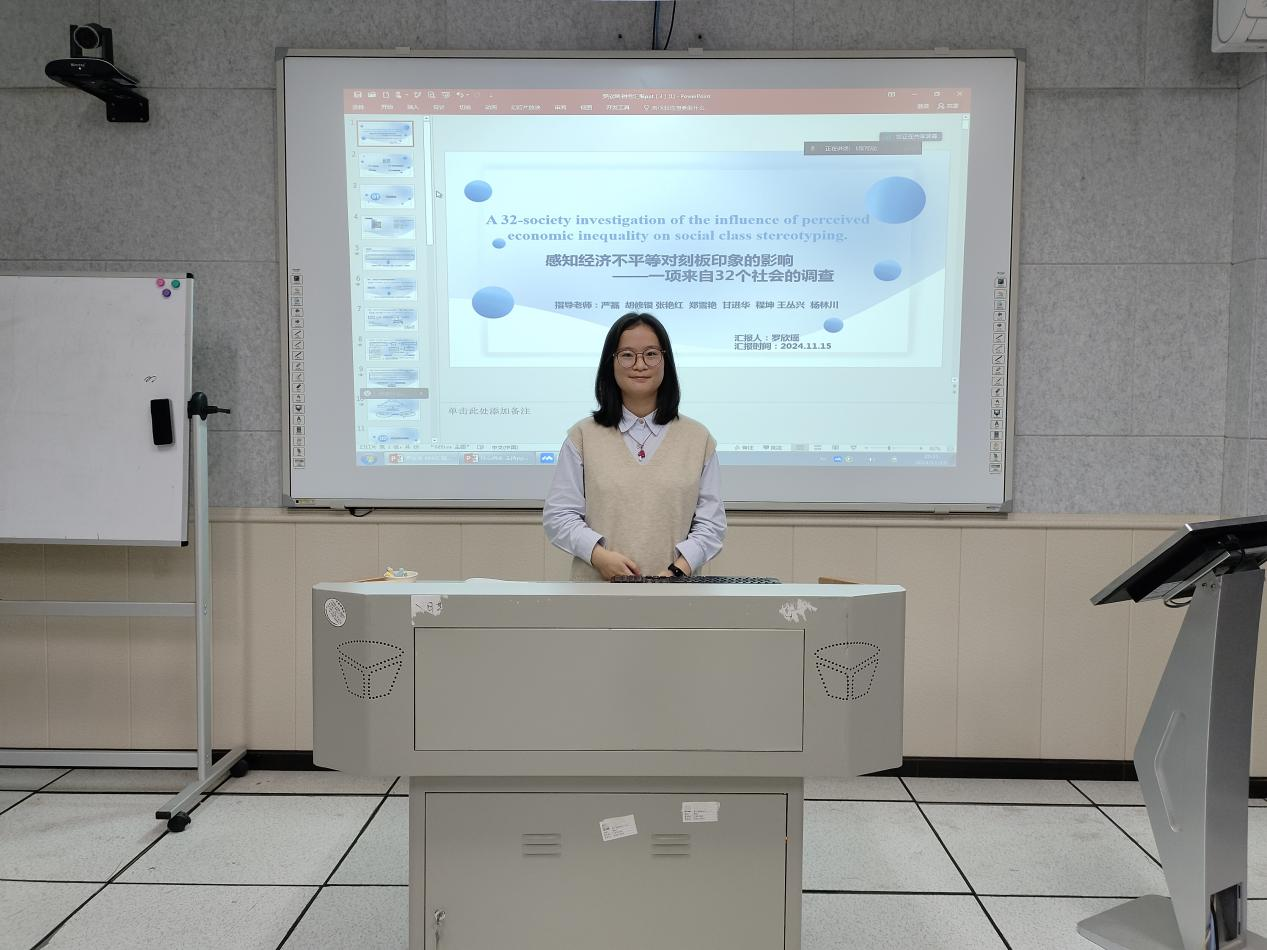 最后,罗欣瑶同学依据《感知经济不平等对刻板印象的影响——一项来自32个社会的调查》这篇文献进行汇报。在现代社会,经济不平等现象广泛存在,其对社会阶层刻板印象的影响也引发了诸多关注,该研究深入探讨了这一影响及其背后的机制,跨越了32个不同社会,运用问卷调查法收集数据。结果表明:感知经济不平等会增强对富人负面刻板印象、穷人正面刻板印象的形成,社会结构特征在这一机制当中起部分调节作用。这一研究为理解感知经济不平等和刻板印象之间的关系提供了新的视角,对政策制定和促进社会公平有着重要启示。