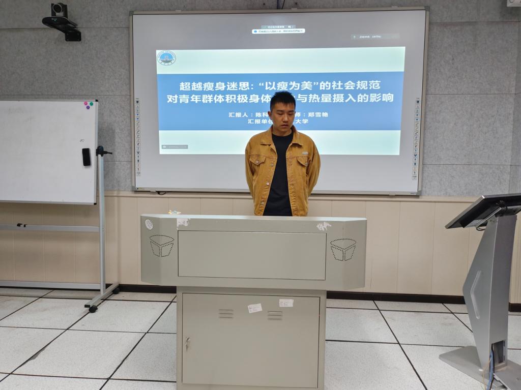 首先,陈科同学对《超越瘦身迷思:"以瘦为美"的社会规范对青年群体积极身体意象与热量摄入的影响》这篇文献进行汇报。该研究进行了4项研究,结果发现,青年群体“瘦理想”社会规范感知越强,其积极身体意象水平越低;进一步研究发现榜样因素描述性社会规范干预对积极身体意象与热量摄入产生积极影响,且干预持续时间更长。以上研究结果丰富了“瘦理想”社会规范的影响机制研究,提出并验证了更有效的社会规范干预方式,为个人与健康领域商业机构提供了实践建议。在汇报最后,陈科同学也分享了自己对于这篇文献的感悟和思考。