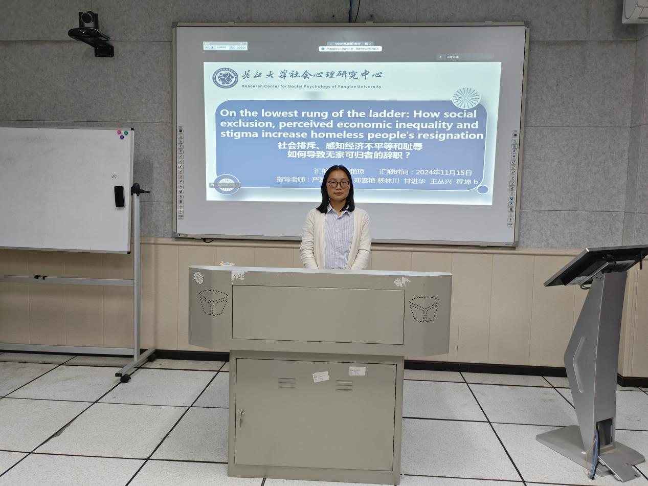其次,由钟艳琼同学进行汇报,题目为《社会排斥、感知经济不平等和耻辱身份如何导致无家可归者的辞职》。该研究指出社会排斥、经济不平等与无家可归者的辞职息息相关。通过对无家可归者和非无家可归者群体进行了两项准实验研究,考察社会排斥对无家可归者辞职水平的影响,以及感知经济不平等的耻辱身份在这一机制中的作用。结果表明感知经济不平等会增强耻辱身份认同,进而增加社会排斥,最终导致无家可归者的辞职。