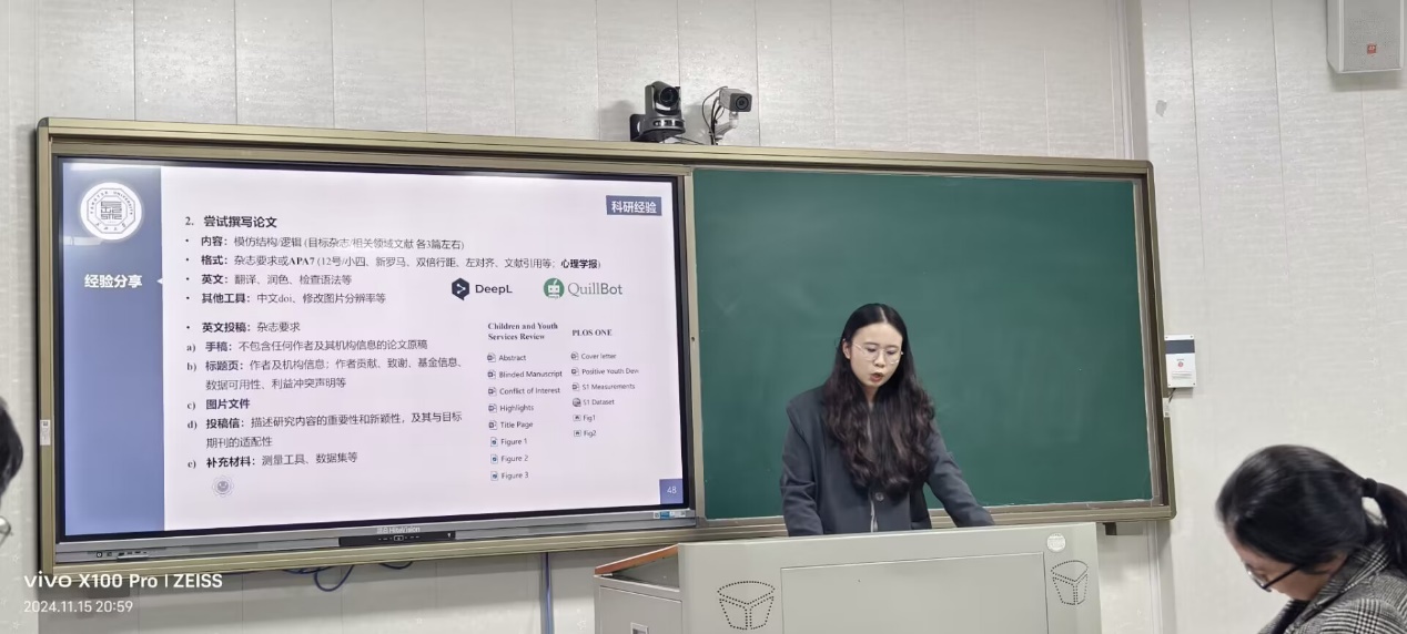 2024年11月15日晚7点整,本学期青少年网络心理与行为第九期例会在十一教205如期举行,连帅磊老师、朱晓伟老师、甘雄老师、周婷老师出席了本次例会,同时还有众多研究生和本科生积极参与其中,会议氛围活跃而充满学术气息。 本次例会首先由秦柯楠同学带来他的毕业论文进展汇报。秦柯楠同学详细介绍了其研究的背景、目的、方法和目前的进展情况,以及在研究过程中遇到的一些挑战和解决方案。他的汇报条理清晰,内容详实,为在场的同学提供了宝贵的研究经验。 汇报结束后,我们举办了一场别开生面的茶话会。在轻松愉悦的氛围中,所有同学畅所欲言,分享了各自在学习、研究和生活中遇到的困惑。老师们和高年级的学姐学长们耐心倾听,并针对同学们提出的问题进行了细致的解答和指导,帮助大家理清思路,找到解决问题的方法。 茶话会之后,秦柯楠同学还进行了一次经验分享。他结合自己的学习和研究经历,与大家探讨了如何高效管理时间、如何克服研究中的困难以及如何保持良好的心态等问题。他的分享既实用又鼓舞人心,让在场的同学们受益匪浅。 随着秦柯楠同学的经验分享结束,本期例会也圆满落下帷幕。大家都感到收获颇丰,不仅学到了新知识,也得到了心灵上的慰藉。让我们共同期待下一期例会的精彩内容,继续在学术的道路上携手前行!