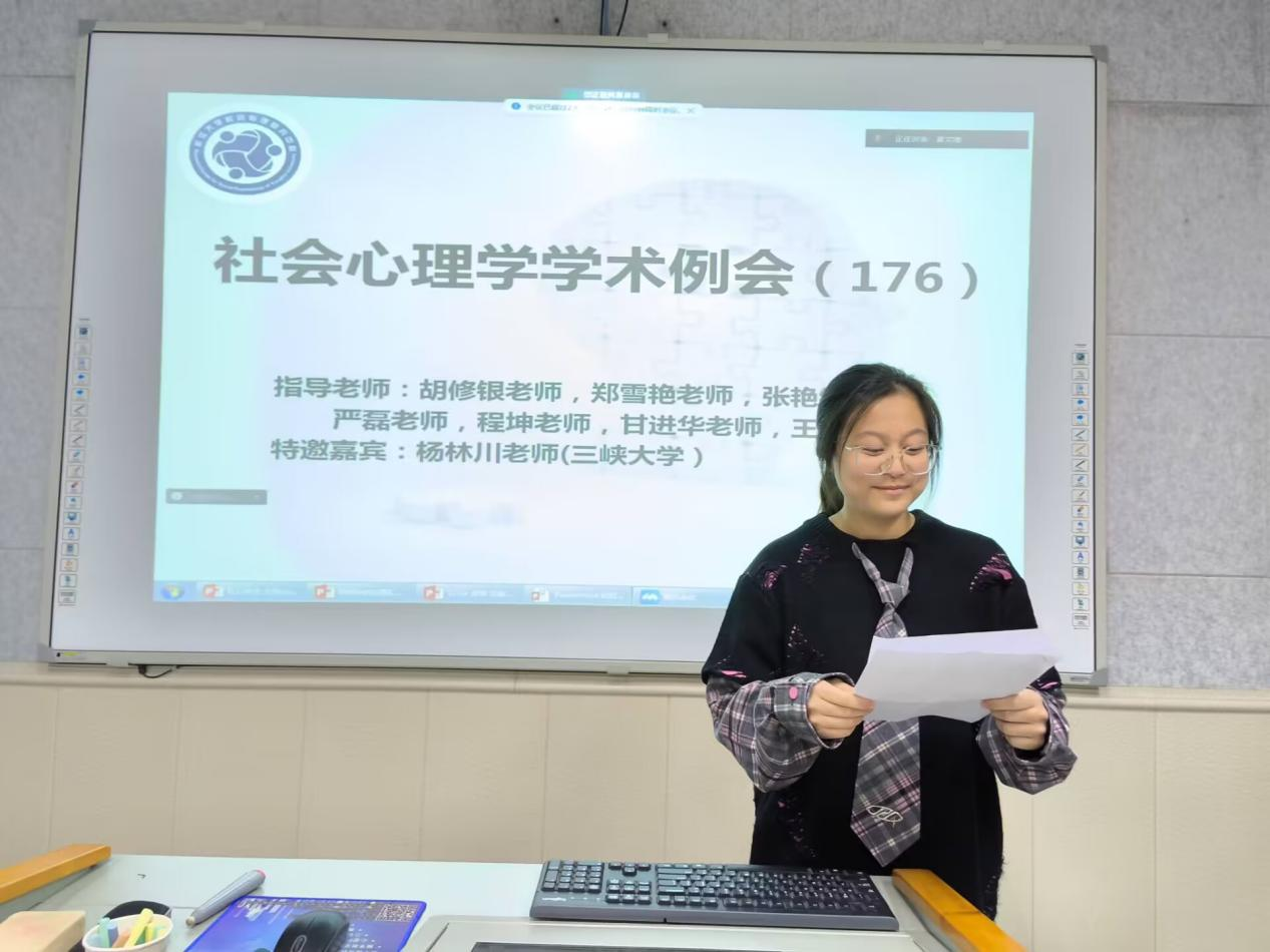 (通讯员:姜静楚)2024年12月20日19时00分至21时00分,第176期社会心理学学术例会在11教201室如期举行,本次例会采用线上线下相结合的模式,主题为“文献分享汇报”,由本科生科研助理夏文婕同学主持。参加例会的老师有甘进华老师、严磊老师、王丛兴老师和来自三峡大学的杨林川老师,员工有10名心理学研究生、31名本科生科研助理。