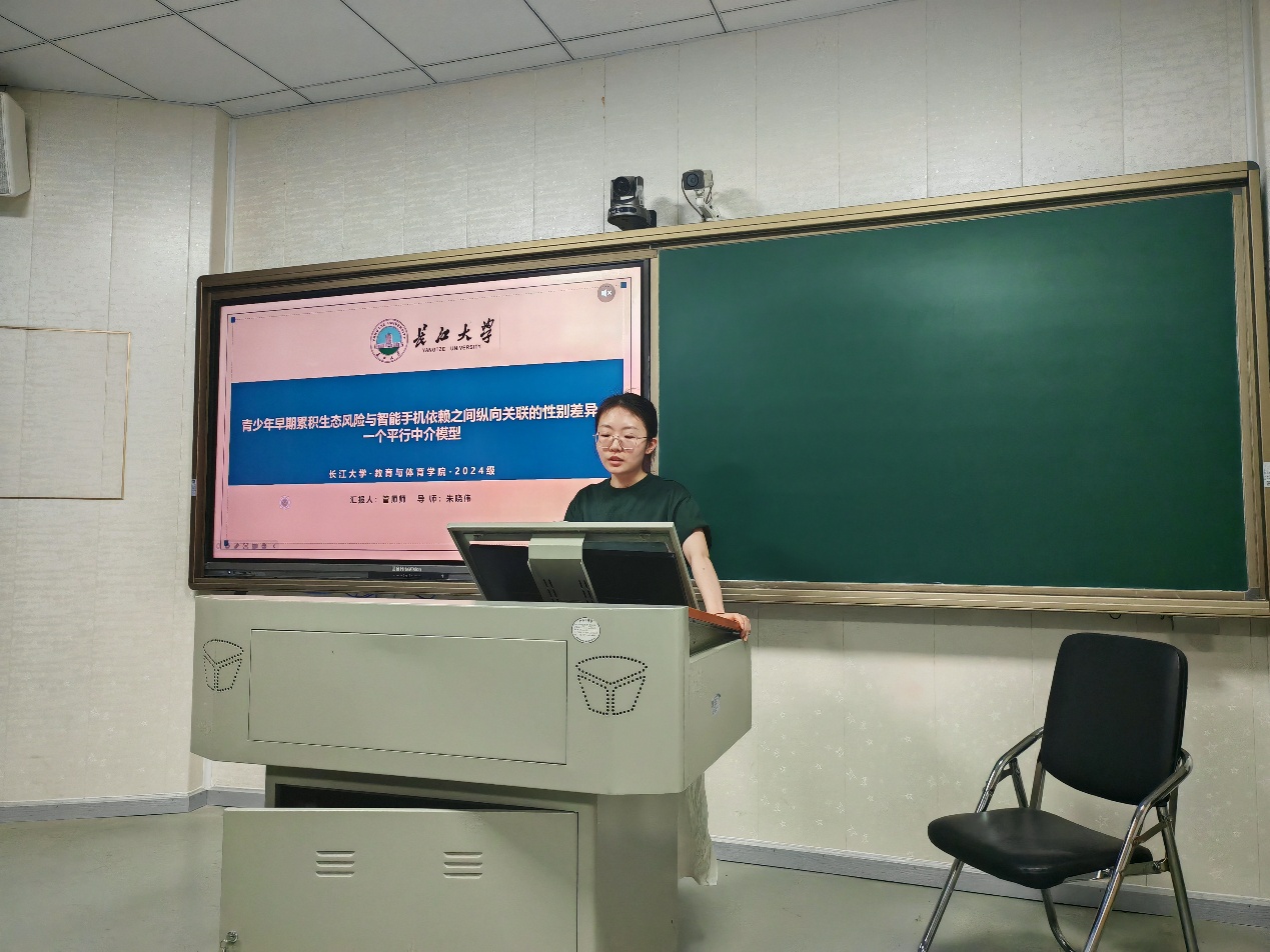 最后,管师师同学汇报了文章《Gender differences in the longitudinal association between cumulative ecological risk and smartphone dependence among early adolescents: A parallel mediation model》。此研究通过平行中介模型,分析了早期青少年中累积生态风险与智能手机依赖之间纵向关联的性别差异。朱晓老师在点评时,针对研究中的中介模型进行了详细讲解,对模型构建的合理性以及变量之间的关系进行了深入剖析,并对同学们在使用此类模型进行研究时应注意的问题提出了指导意见。