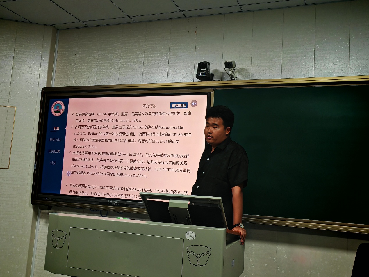 接着,王佳祥同学汇报了Symptom structure of complex posttraumatic stress disorder among Chinese young adults with childhood trauma: a network analysis。该研究通过网络分析的方法,对有童年创伤的中国年轻成年人中复杂创伤后应激障碍的症状结构进行了探讨。朱晓伟老师在点评中,对研究中网络分析方法的运用进行了深入讨论,指出了该方法在研究此类问题时的优势与可能存在的局限,同时强调了在研究中对数据处理和结果解读的严谨性。