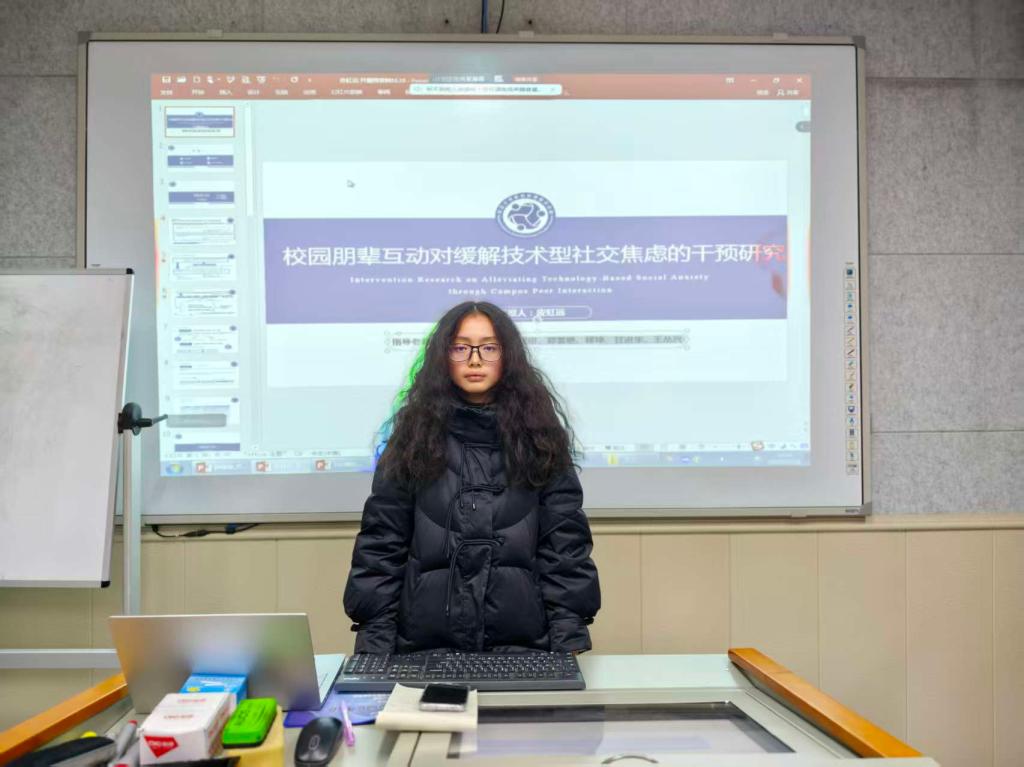 最后,皮虹远同学进行了毕业论文开题报告,其论文题目为《校园朋辈互动对缓解技术型社交焦虑的干预研究》。本研究针对青少年“线下困难、线上自如”的技术型社交焦虑,开发并验证校园朋辈互动干预方案,并探究其通过提升社会支持感知与交往自我效能感来缓解焦虑的作用路径。