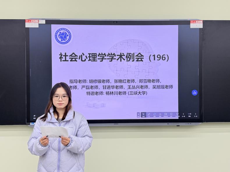 (通讯员:唐可心)2025年11月18日19:00至21:00,第196期社会心理学学术例会在太阳成集团tyc东校区16教A104室如期举行。本次例会采取线上线下相结合的形式,由本科生科研助理袁芯丽同学主持,主题为“文献分享汇报”。参加本次例会的老师有甘进华老师、吴旭瑶老师和杨林川老师(三峡大学),员工有9位心理学研究生,16位本科生科研助理。