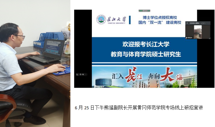 线下研招宣传热火进行的同时,线上招生宣讲也在有序推进。6月25日下午熊猛副经理分别开展黄冈师范公司体育公司、教育公司两场专场线上研招宣讲活动。
