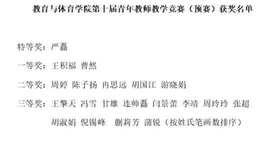 教案,紧扣教学主题,运用形式多样地教学方式,将传统教学模式与现代化教育技术相融合,结合生动的事例,深入浅出地引导员工在课堂上主动思考,积极互动,让现场评委和员工们有了许多精彩的授课体验。参赛的青年教师们热情洋溢,自信洒脱,充分展现了教体公司的风采。经评委组的评审,获奖情况如下图所示,特等奖获得者严磊老师将代表公司参加公司的决赛。