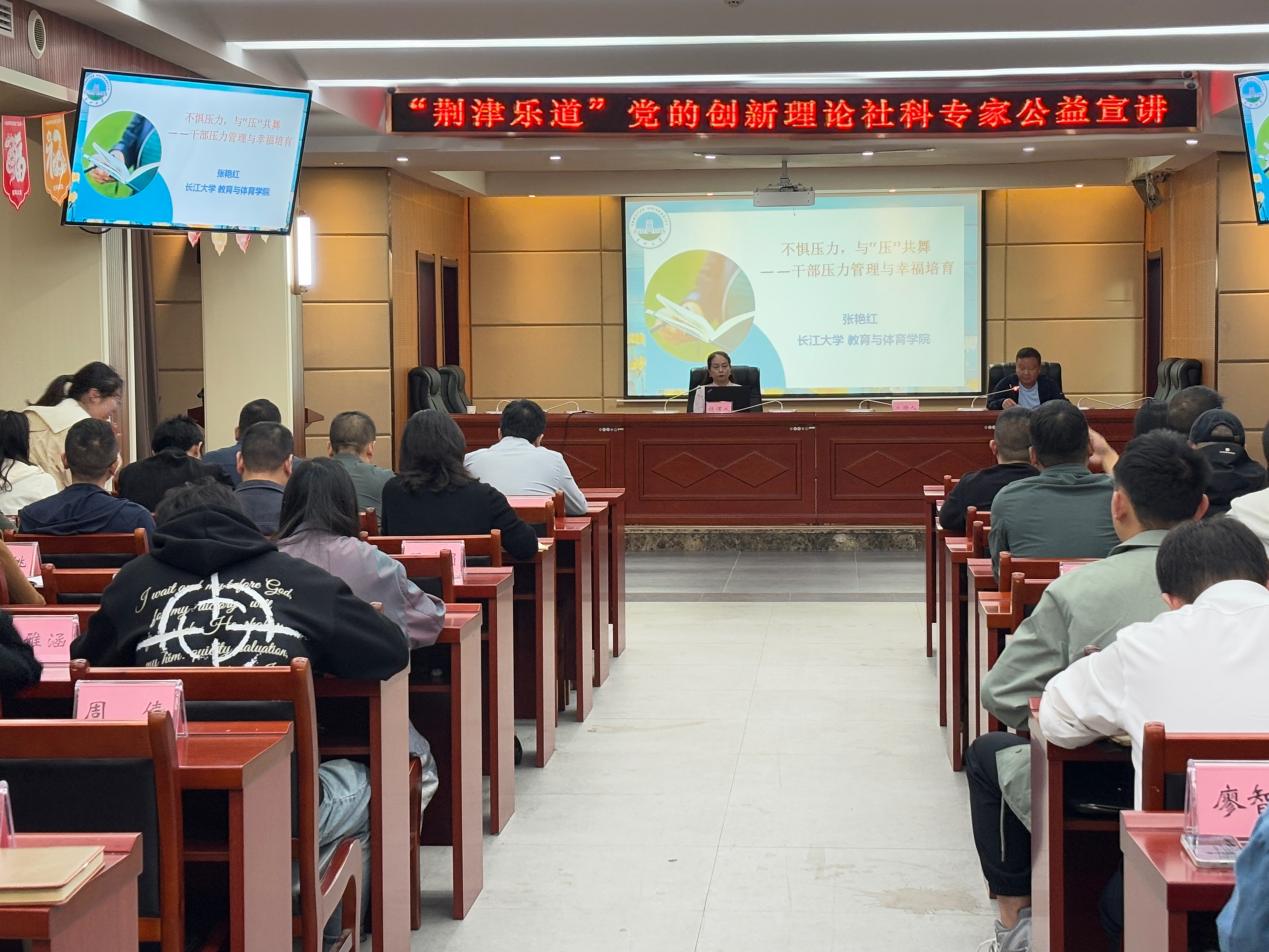 (通讯员:李咏颖)9月23日,为缓解松滋市党员干部压力,提高工作与生活幸福感,公司张艳红教授作为荆州市“荆津乐道”党的创新理论社科专家成员赴松滋市人社局,为全市党员干部带来“压力管理与幸福培育”的精彩分享。讲座主要从正确认识压力、探寻压力来源与压力管理策略三个方面开展。