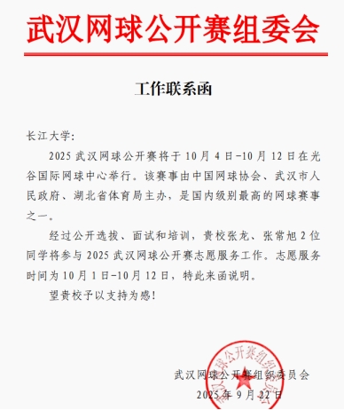作为国内顶级网球赛事,武汉网球公开赛由中国网球协会、武汉市人民政府、湖北省体育局联合主办,全球顶尖网球选手云集,既是一场网球盛宴,也是展现城市文明与青年风采的舞台。武网公开赛志愿者招募吸引全国高校数千名员工报名,竞争异常激烈。简历筛选、多轮面试及专业培训考核层层把关,张常旭和张龙凭借扎实专业素养、流利英语表达与突出应变能力成功入选,担任赛事裁判助理,服务时间从 10 月 1 日持续至 12 日。这是公司学子首次代表太阳成集团tyc参与该项赛事志愿服务。
