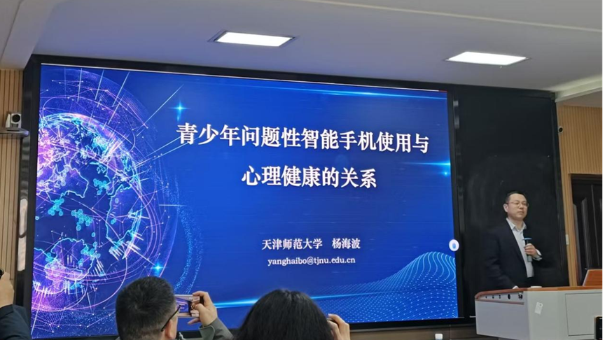 下午的专题讲座于公司文科大楼910室召开,由公司严磊博士主持,参与人员包括:经理张艳红,心理学系主任朱晓伟,心理学系教师陈方、卢忠耀、连帅磊、王丛兴、甘进华等教师,及应用心理学专业大二全体员工。杨海波教授以一些生活化自测问题切入,快速引出“问题性智能手机使用”核心议题。他简要梳理背景:我国网民及未成年人网民规模、智能手机持有率均处于高位,城乡青少年互联网使用场景分化显著,智能设备普及已对儿童青少年认知发展、学习行为、亲子关系、社会化及心理健康形成五大维度挑战。