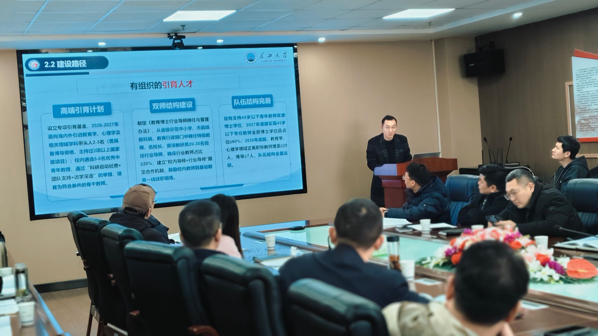 其次,教体公司经理助理严磊博士从必要性与意义、建设目标与路径、任务分解三方面汇报方案:从国家教育高层次人才需求、公司学科布局优化、社会教育服务升级的维度,明确教育管理、课程教学、员工发展三大研究方向;提出有组织引育人才、强化科学研究、搭建学科平台的建设路径,并对标博士点申报条件,细化了各阶段任务分工。