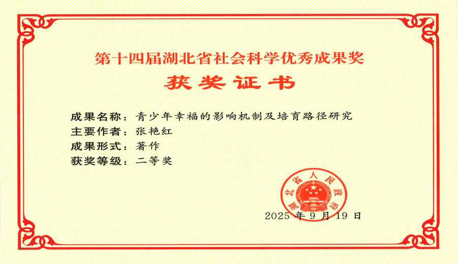 (通讯员 何巧楠)近日,湖北省社科成果奖证书颁发,公司张艳红教授凭借专著《青少年幸福的影响机制及培育路径研究》,喜获第十四届湖北省社会科学优秀成果奖二等奖。这一荣誉既是对其深耕青少年心理健康领域的学术认可,也彰显公司社科应用研究紧扣时代需求、服务青少年成长的坚实实力,为公司科研工作历史性突破添彩。