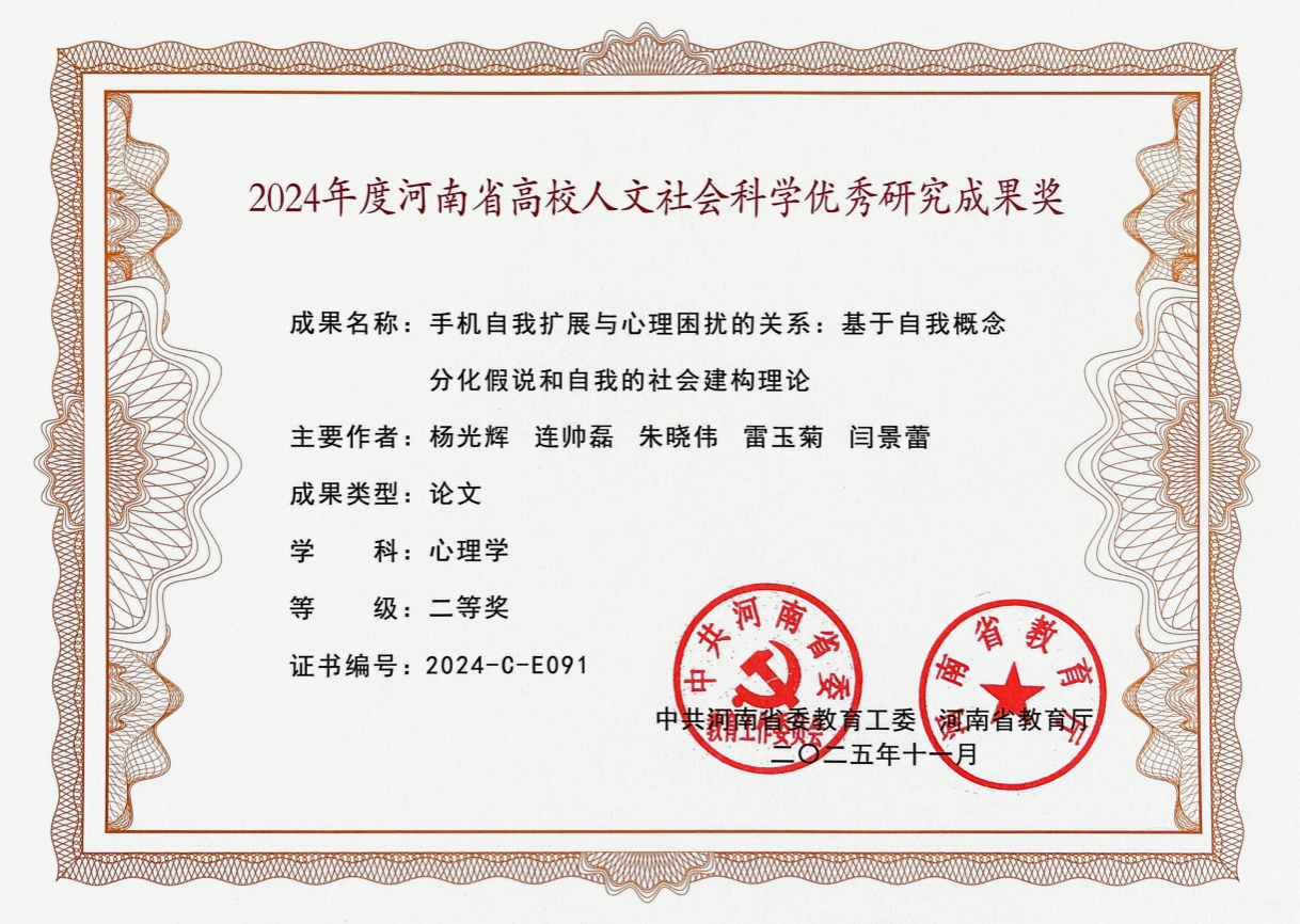 (通讯员:何巧楠)近日,2024年度河南省高校人文社会科学优秀研究成果奖获奖名单正式公布,由公司连帅磊副教授作为共同第一作者完成的研究论文《手机自我扩展与心理困扰的关系:基于自我概念分化假说和自我的社会建构理论》荣获二等奖。