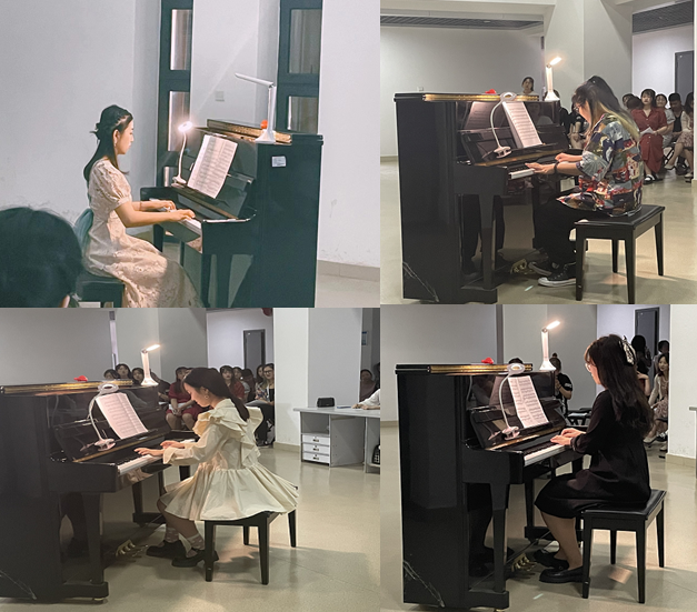 6月4日,钢琴考核在文科大楼三楼大厅举行,共计展演了32首钢琴曲目,其中包括《小奏鸣曲第一乐章》、《四小天鹅舞曲》、《菊次郎的夏天》、《致爱丽丝》等名曲,钢琴考核中大部分同学能流畅弹奏歌曲,正确表达作品的风格和情绪。