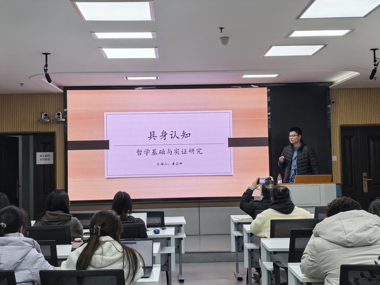 王丛兴博士讲座的主题是《具身认知的哲学原理及实证研究》,他从两个部分进行了论述,以哲学思想为基,引入理性主义和经验主义的内涵,并围绕身体现象学展开。他指出身体不仅是物理性的,也是现象性的,结合“蝴蝶效应”谈及钟表式科学与混沌系统,从系统水平理论视角对心智进行拓展性定义,向同学们介绍了延展认知、生成认知、概念隐喻和道德隐喻等含义。