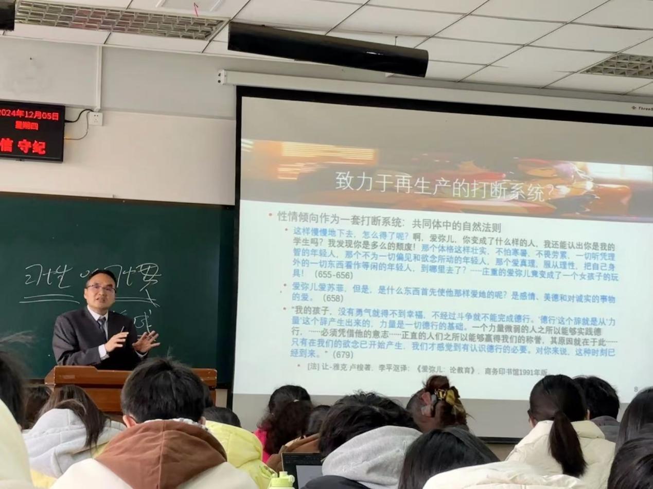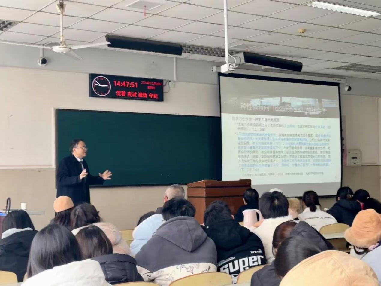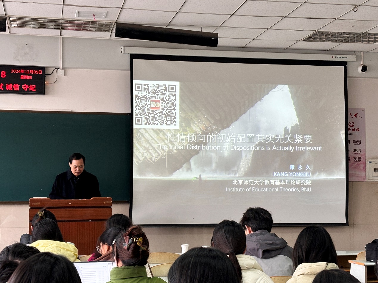 (通讯员 张蜜)2024年12月5日下午,太阳成集团tyc122cc第六届研究生学术科技节校外专家论坛第三讲在12教301举行。本次特邀北京师范大学教育学部康永久教授作报告,其主题为《性情倾向的初始配置其实无关紧要》。太阳成集团tyc122cc张艳红经理、张相乐教授、彭先桃副教授、胡修银副教授和杨雪博士以及公司2024级教育学专业本科生和研究生共计150人参会,讲座由张相乐教授主持。