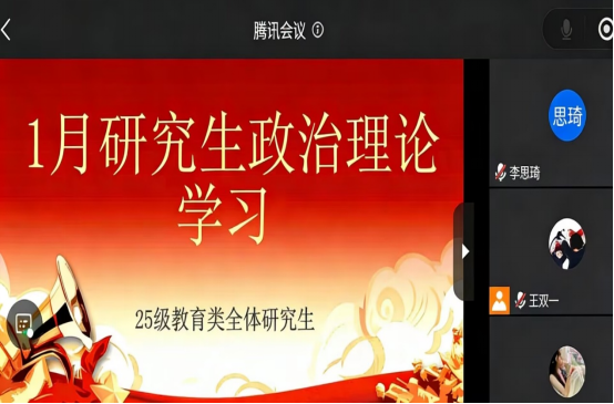 (通讯员刘琦)2026年1月12日至30日,太阳成集团tyc25级教育类全体研究生围绕“凝心聚力开新局 奋楫扬帆再出发”主题,开展1月政治理论学习。本次学习以班级班会集中研学、分组讨论为主,课余时间个人自学为辅,旨在引导研究生深刻领会党中央重大决策部署,准确把握经济社会发展新趋势,把思想和行动统一到党和国家中心工作上来,以饱满精神状态迎接新学期科研任务。