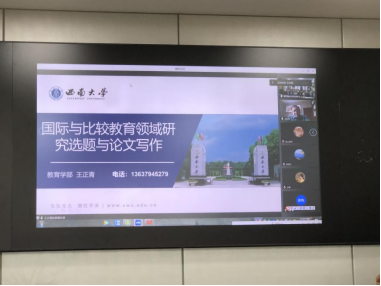 活动伊始,熊猛副经理隆重地介绍了王正青教授,王教授主要从事和平教育理论与实践、教育信息化国际比较、中亚国家教育改革与发展等领域研究,主持国家社科基金、教育部人文社科、全国教育科学规划课题等省部级课题10余项,在《教育研究》等CSSCI期刊发表文章80余篇,出版专著4部。王教授科研成果丰硕,在论文选题、写作方面富有经验。随后,王教授以《国际与比较教育领域研究选题与论文写作》为主题,从切准论文选题、搭好分析框架、做实文章论证、擅找研究资料、遵循格式规范五个方面展开论述。并通过实例讲解了每一步骤的实际操作方法;如什么是好的选题、怎样提炼问题、前言到底应该怎么写等实用问题。