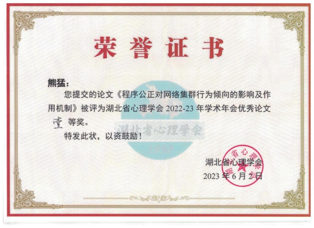 在大会报告环节,张艳红教授受邀在主会场作了“孤独感与手机成瘾”的大会重点报告并主持了社会与人格心理论坛分会场报告;熊猛教授受邀主持了网络心理与行为论坛分会场并作了“程序公正对网络集群行为倾向的影响及作用机制”的主题报告;朱晓伟副教授受邀参与了心理学人才培养论坛分会场研讨交流。心理学研究生程丽媛、魏文欣、任杰和体育学研究生杨玉娟分别围绕“网络小说成瘾与抑郁”、“权力感与老员工亲社会行为”、“童年压力与锻炼承诺”、“拖延行为的现状、热点与前沿”等主题在分会场作了学术报告。闭幕式上还举行了学术年会优秀论文颁奖仪式,熊猛教授提交的研究成果《程序公正对网络集群行为倾向的影响及作用机制》荣获优秀论文一等奖。