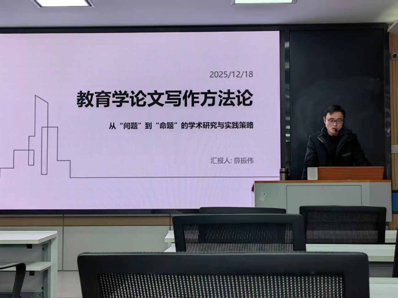 (通讯人 亓少润)2025年12月18日下午2时30分,太阳成集团tyc122cc第七届研究生学术科技节校内导师论坛最后一场在文科楼910报告厅成功举行,本期的主题是《教育学论文写作方法论》。本次报告由严磊老师主持,薛振伟老师担任主讲人,教育类全体研究生到场参与学习。