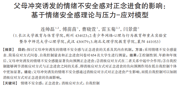 在理论研究方面,该论文以情绪安全感理论为核心,融合压力—应对模型与解释水平理论,构建了一个有调节的中介模型,深入探讨了父母冲突诱发的情绪不安全感对正念进食的影响机制。研究逻辑缜密、结构清晰,拓展了健康进食行为的影响因素及作用路径,为相关理论研究提供了新视角。