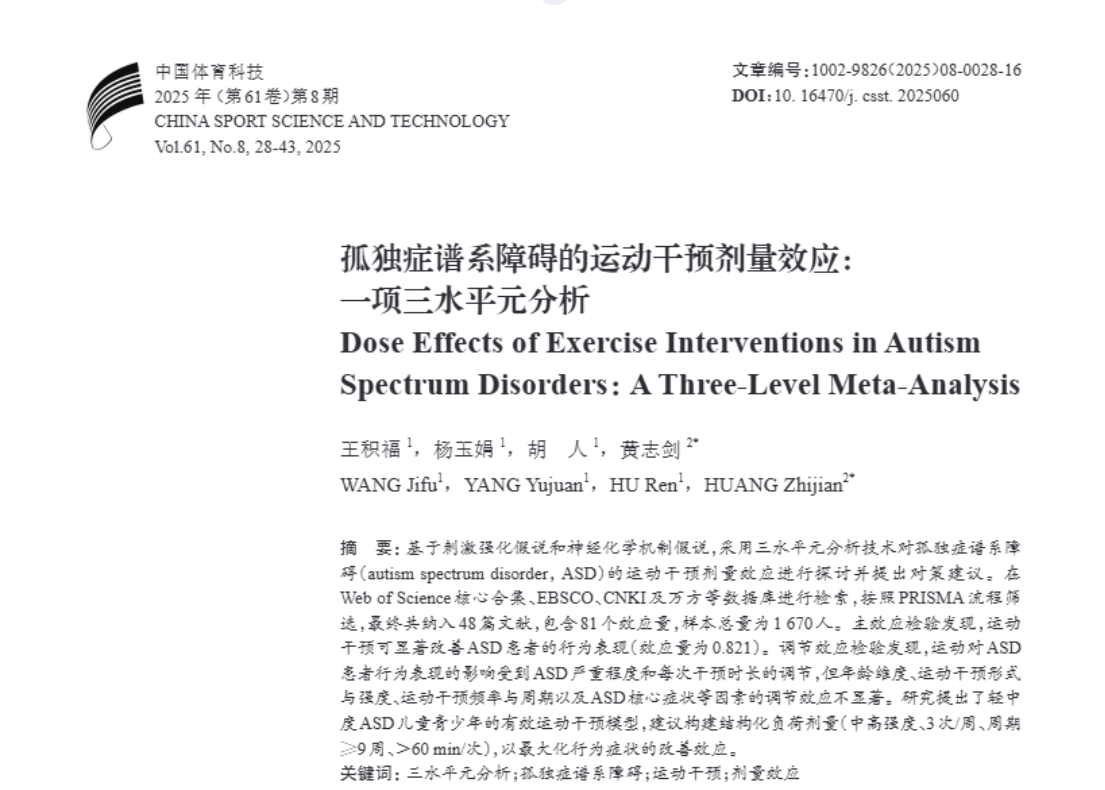 (通讯员:丁雨晴)近日,公司王积福副教授及其团队与武汉体育公司黄志剑教授合作的科研成果《孤独症谱系障碍的运动干预剂量效应:一项三水平元分析》,已在体育科学领域权威期刊《中国体育科技》上作为重点推荐论文正式发表。该研究由教育部人文社会科学研究项目基金资助(项目编号:23YJCZH206)。《中国体育科技》由国家体育总局主管、国家体育总局体育科学研究所主办,多年来一直是中国人文社会科学核心期刊、CSSCI来源期刊,并被中国社科院期刊评价报告评为核心期刊,在《太阳成集团tyc高质量期刊目录》中被定义为T1级别。