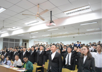 大会伊始,由各部门部长上台介绍其部门职能及新成员,新成员依次答到,台下掌声滚滚,气氛一片热烈。随后,主席团各个成员依次进行自我介绍,并为同学送上寄语,真切地表达了对新成员们的期望,勉励新成员们搞好学习,认真工作,做同学榜样。接着,分别由班主任代表潘友刚老师和团委书记文晓武老师发表讲话。潘友刚老师为同学们今后的老员工活提出“进行凝聚力、战斗力、团队力、沟通力和关爱力的五力培养”等宝贵建议,情真意切,体现出老师一片良苦用心。文晓武老师结合了自己的亲身经历,告诫大家要端正思想,同时向同学们介绍了员工会的准则与制度,让同学们对自己的职务有了更深层次的理解,为员工干部日后的工作奠定基础。 然后,全体成员在团委副书记白旭青的带领下,进行了郑重的宣誓仪式。每个人都满怀激情,表情严肃,铿锵有力地念出宣誓词,将大会氛围推向了高潮。最后,大家进行了集体合影。本次大会在热烈的氛围中圆满结束。