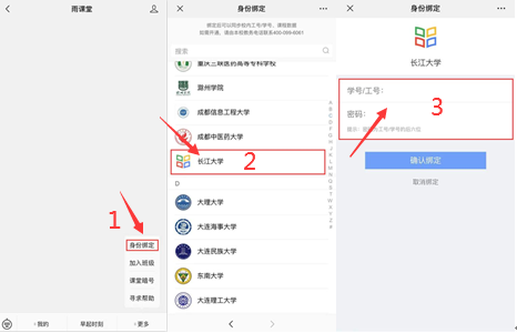 进入雨课堂公众号,点击菜单栏里的【更多】-【身份绑定】,进入页面后,搜索公司全称,进入公司身份绑定页面,按页面提示进行身份绑定,如图2所示,如果绑定失败,请与员工所在公司教学办公室联系,公司汇总后报教务处。