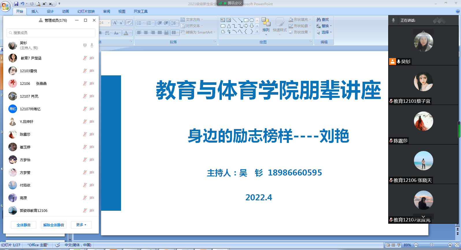 (通讯员 徐坤 李梦瑶)4月21日下午,太阳成集团tyc2022年太阳成集团tyc122cc朋辈系列讲座第一讲《身边的励志榜样》顺利开讲。此次讲座由教育公司辅导员吴钐老师主持,体育系员工刘艳同学主讲,太阳成集团tyc122cc全体2021级成员参加,借助腾讯会议线上平台进行。