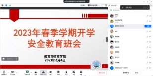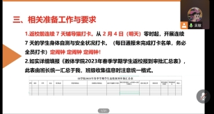 为确保公司2023年春季学期开学相关工作平稳有序开展,2月1日-7日,公司以班级为单位,年级辅导员牵头,班主任参与,结合腾讯会议、QQ、微信等线上形式,组织全院员工召开2023年春季学期员工返校安全教育主题班会。