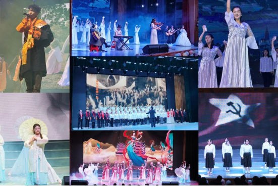 紧接着,《入画敦煌》蹁跹的衣袂带领观众们步入第三篇章“铿锵行·共创未来”。在舞台剧《青春中国》的朗诵声中,五四运动的呐喊穿透百年岁月,仍在青年们的心中久久回荡;身穿藏服,手捧金色哈达,《纳瓦吉瓦》用藏语表达对全体师生的美好祝愿,充分展现了鲜明民族特色;大合唱《如愿》为过去的2023年画下圆满的句号。全体师生共度今宵,共抒情谊,展现出教体公司团结向上、和谐进取的氛围。